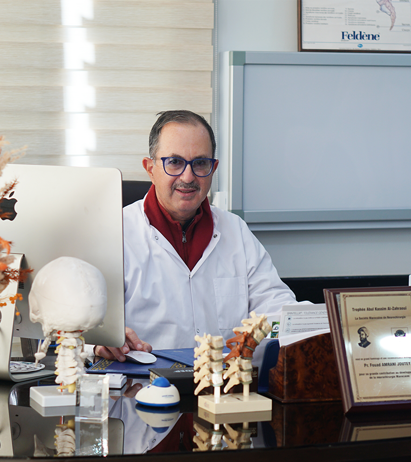 Le Professeur Amrani Joutey Fouad est une figure emblématique de la neurochirurgie au Maroc, cumulant plus de 30 ans d’expérience dans le diagnostic et le traitement des maladies du système nerveux. Diplômé de la faculté de médecine de Rabat et ayant perfectionné son savoir-faire en France à travers plusieurs spécialisations et hyperspécialisations, il a su allier expertise et innovation pour offrir des soins de pointe à ses patients.